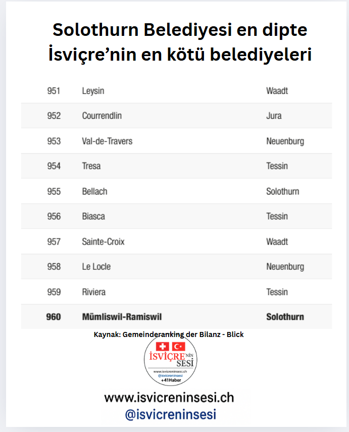 Listenin en altında, daha önce de defalarca “sonuncu” olan Mümliswil-Ramiswil (Solothurn) Listenin en sonunda, geçmişte de sık sık “en kötü belediye” seçilen Mümliswil-Ramiswil (Solothurn) bulunuyor. Onun ardından Riviera (Tessin) ve Le Locle (Neuchâtel) geliyor. En kötü 10 belediyenin çoğu ise İsviçre’nin Fransızca konuşulan bölgelerinden ve Tessin kantonundan çıktı.